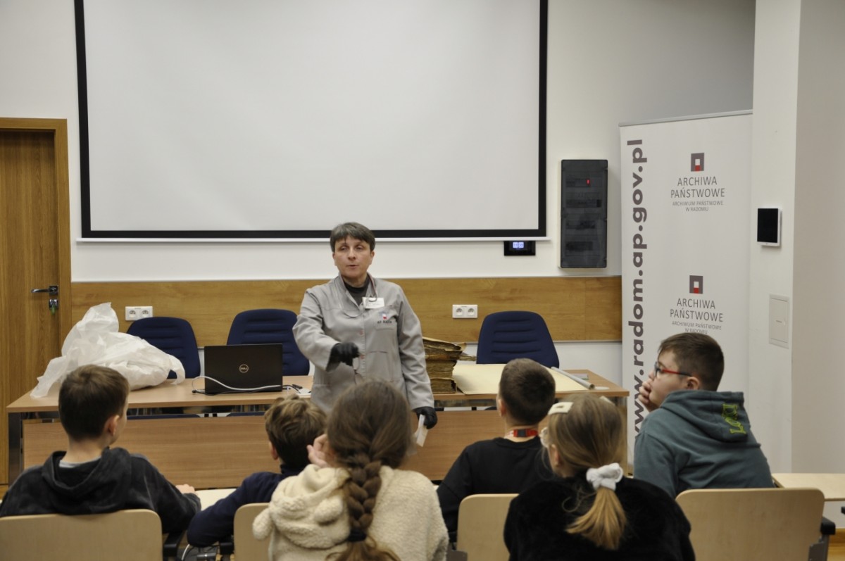 Dzieląc się swoją szeroką wiedzą i doświadczeniem opowiedziała o zawodzie archiwisty. Omówiła zadania i funkcjonowanie Archiwum Państwowego w Radomiu. Zaprezentowała wybrane materiały archiwalne i omówiła warunki ich przechowywania.