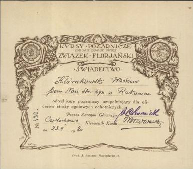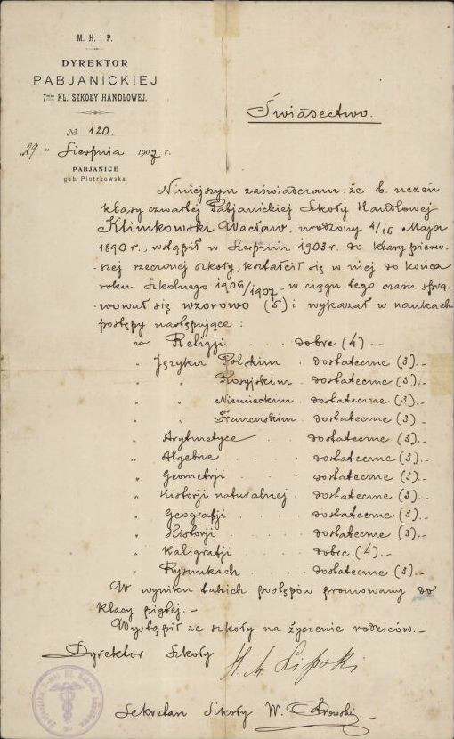 Wacław Klimkowski, wnuk Aleksandra i syn Ignacego, urodził się 16 maja 1890 r. w Wąchocku. Od wczesnego dzieciństwa był związany z Wierzbnikiem, gdzie mieszkali i zmarli jego rodzice oraz jego przyszli teściowie – Edward (1839–1912) i Anna Ludwika z domu Szenuar (1865–1906) Pajkertowie. Tam też poznał swą przyszłą żonę – Ludwikę Mariannę Pajkert (ur. 11 marca 1889 r., zm. w 1945 r.). W roku 1902, po ukończeniu szkoły powszechnej w Wierzbniku, Wacław podjął naukę w 7-klasowej Szkole Handlowej w Pabianicach. Była to placówka ciesząca się doskonałą opinią. Będąc w roku szkolnym 1906/1907 uczniem klasy IV, uczestniczył w strajkach szkolnych. W 1907 r. przerwał naukę, opuścił szkołę i wyjechał z Pabianic. Ostatecznie placówki tej nie ukończył i w roku 1907, mając 16 lat, powrócił do Wierzbnika. W latach 1907–1910 mieszkał tam z rodzicami i pracował na kolei, jednocześnie przyuczając się do zawodu wykwalifikowanego robotnika kolejowego. W 1911 r. wyjechał do Rakowa koło Częstochowy, do pracy w Hucie „Częstochowa” (własność Towarzystwa Zakładów Berrnarda Hantke w Rakowie). Dnia 9 czerwca 1912 r. ożenił się z Ludwiką Marianną Pajkert, córką Edwarda i Anny z Szenuarów. Rok później w Wierzbniku przyszło na świat ich pierwsze dziecko – Janina Irena. Od 1914 r. mocno był zaangażowany w pracę Ochotniczej Staży Ogniowej Huty „Częstochowa”. W 1918 r. stał na czele Milicji Ludowej w hucie, zabezpieczając jej mienie. W 1919 r. został skierowany na kurs do Szkoły Podoficerskiej Milicji Ludowej w Częstochowie, a w rok później ukończył kurs pożarniczy uzupełniający dla oficerów ochotniczych straży ogniowych. W Rakowie w 1921 r. urodziła się druga córka Wacława i Ludwiki – Maria Wacława. Jej ojciec zmarł na gruźlicę 11 września 1923 r. w Rakowie, w wieku zaledwie 33 lat. Pochowany został na Cmentarzu Rakowskim.