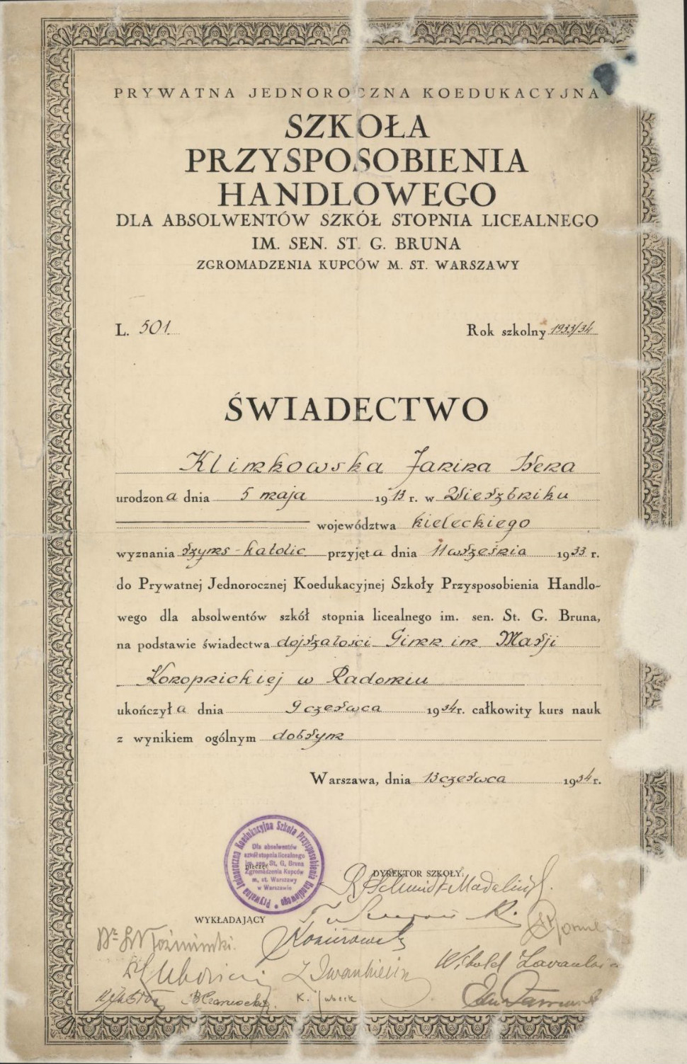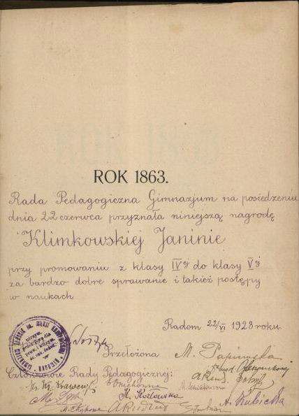 Janina Irena Klimkowska – córka Wacława i Marianny Ludwiki – urodziła się 5 maja 1913 r. w Wierzbniku. Jak już wspomniano, w wieku 10 lat została półsierotą. Jej matka po śmierci męża w 1923 r. wyszła za mąż za wdowca Henryka Mirkowskiego (1875–1930) – właściciela piekarni przy ul. Rwańskiej 10 w Radomiu. Ślub sprawił, że Marianna Ludwika wraz z córkami przeniosła się do swego rodzinnego miasta, w którym mieszkali zresztą krewni jej rodziców. W roku 1926 urodził się syn Ludwiki i Henryka – Henryk Edward, a dwa lata później córka Danuta Magdalena. W 1930 r. Henryk Mirkowski zmarł jednak w szpitalu w Warszawie.