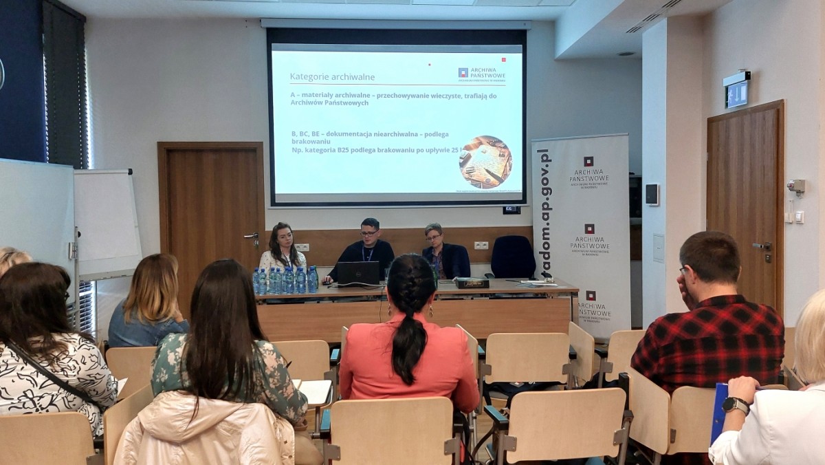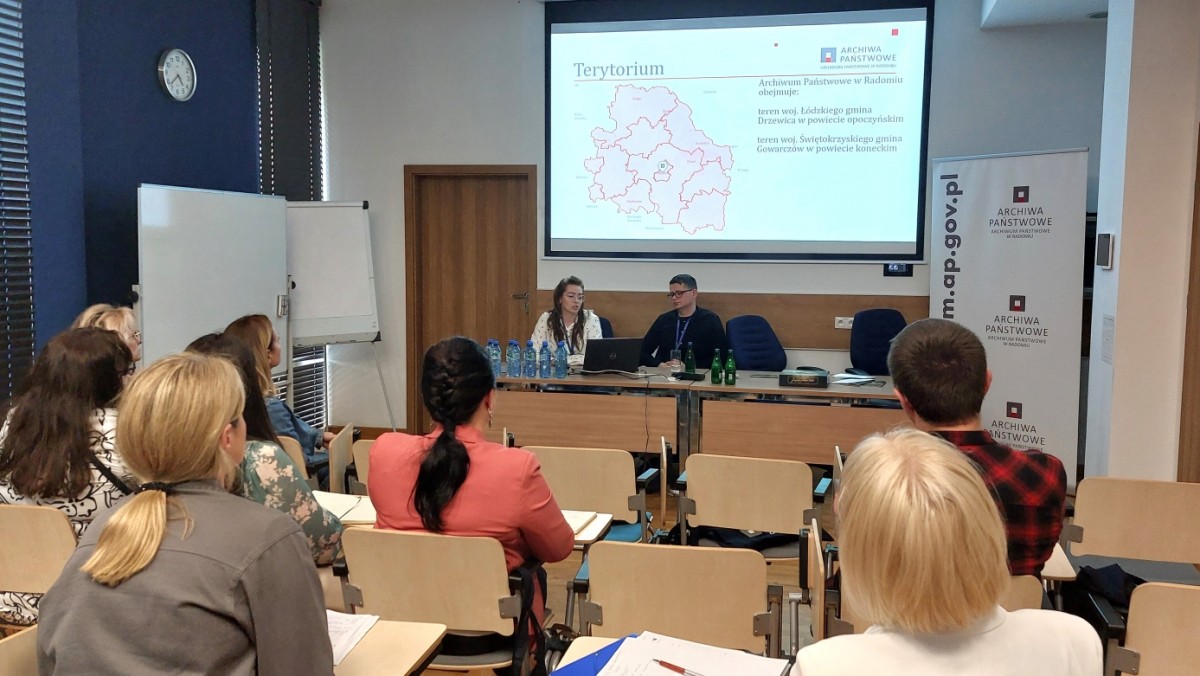 Spotkanie rozpoczęło się od wprowadzenia, które przedstawiły Pani Ewelina Majsterek, Dyrektor Archiwum, oraz Pani Aleksandra Nosowska, Kierowniczka Oddziału II ewidencji, opracowania i zabezpieczenia zasobu. Kolejnym prelegentem był Pan Patryk Stankowski, archiwista III Oddziału udostępniania zasobu, który przybliżył uczestnikom zagadnienia związane z siecią archiwów państwowych. Przedstawił również historię działalności Archiwum Państwowego w Radomiu oraz zasady udostępniania materiałów. Omówił także możliwości i sposób korzystania z wyszukiwarki portalu www.szukajwarchiwach.pl, która jest kluczowym narzędziem dla nauczycieli poszukujących materiałów źródłowych. Na zakończenie spotkania Pani Marta Urbańczyk, archiwistka II Oddziału ewidencji, opracowania i zabezpieczenia zasobu, zreferowała temat „Zasób archiwalny jako źródło w pracy nauczyciela”. W swojej prezentacji opisała najciekawsze zespoły archiwalne przechowywane w radomskim archiwum, wskazując na ich potencjał edukacyjny w procesie nauczania historii. Spotkanie było okazją dla nauczycieli do poznania narzędzi, które ułatwiają dostęp do źródeł archiwalnych.