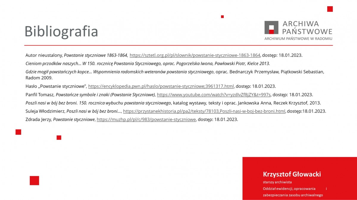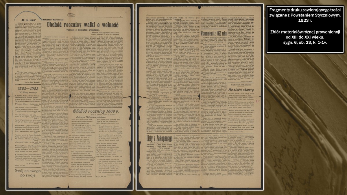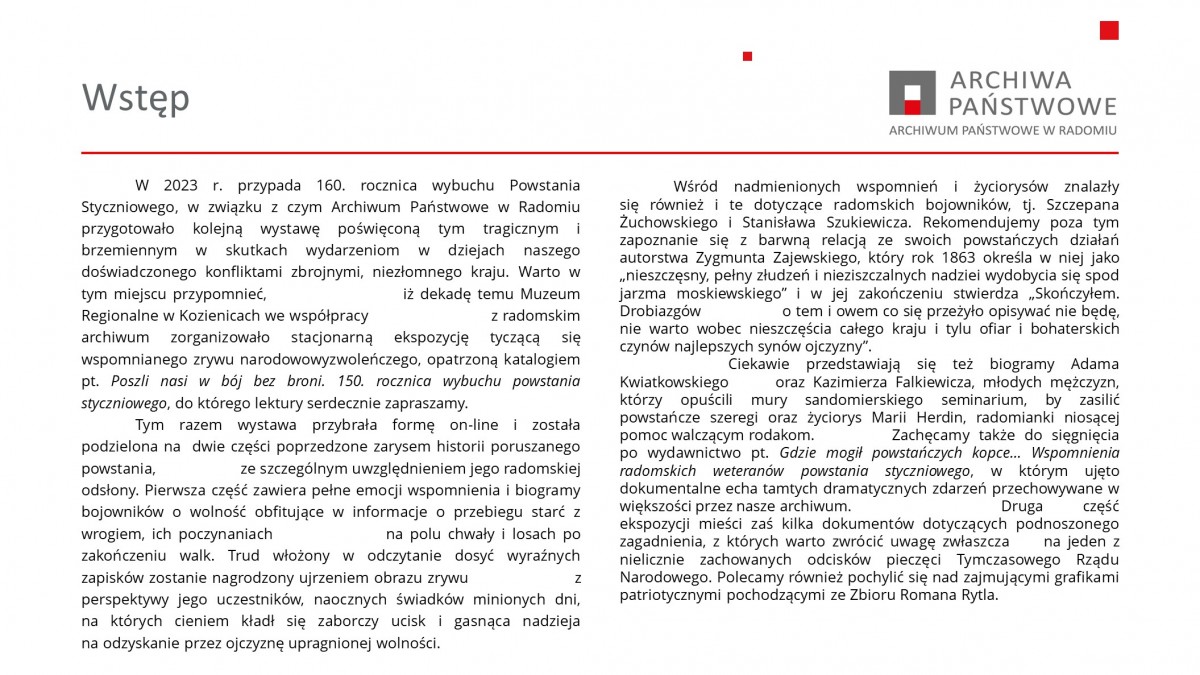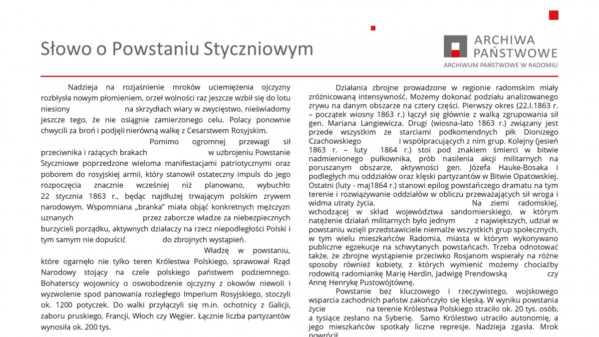 W 2023 r. mija 160 lat od pamiętnego stycznia 1863 r., w którym to Polacy, wiedzeni nadzieją na odzyskanie niepodległości, ponownie chwycili za broń, mimo przytłaczającej przewagi Imperium Rosyjskiego. Archiwum Państwowe w Radomiu w związku z powyższym przygotowało wystawę dotyczącą tych dramatycznych i bohaterskich zdarzeń, które dziś nazywamy Powstaniem Styczniowym.