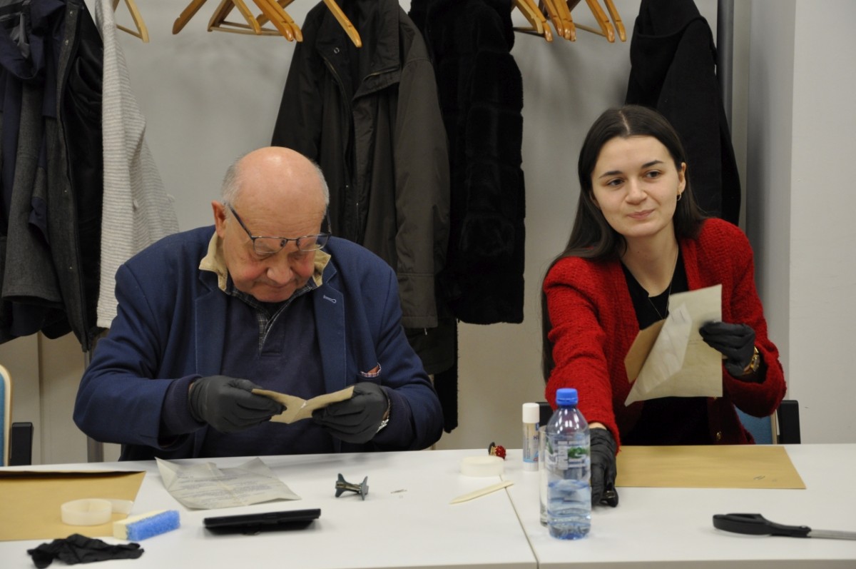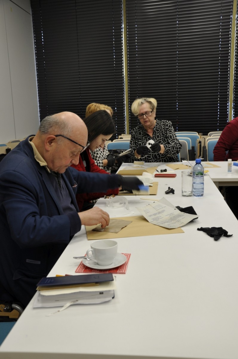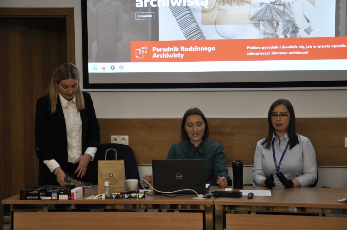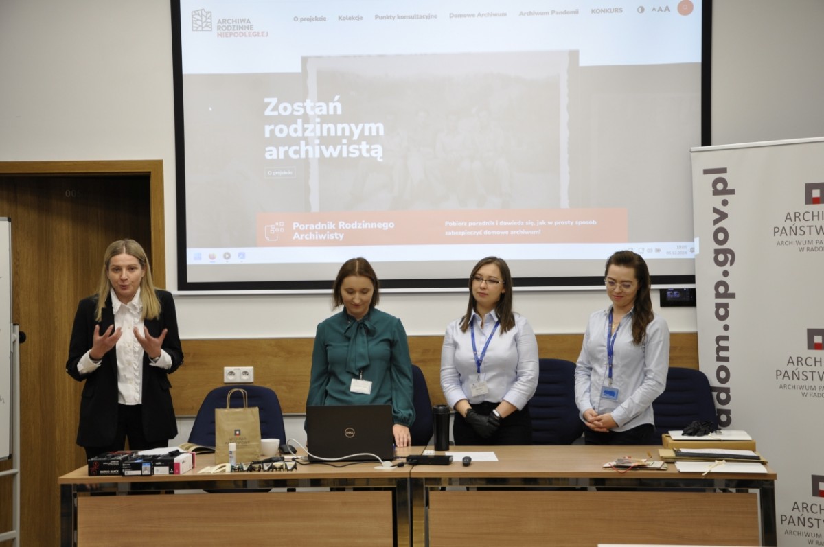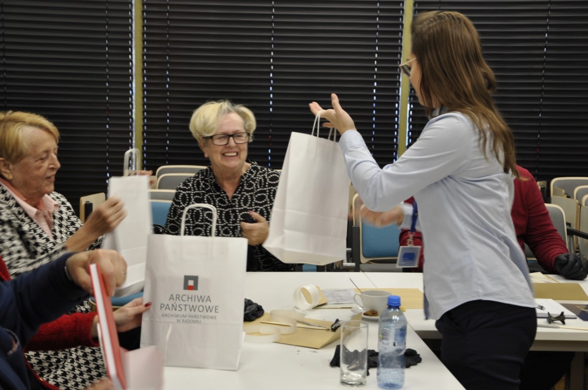 Dyrektor Archiwum Państwowego w Radomiu pani Ewelina Majsterek przywitała gości i przedstawiła prowadzące wydarzenie archiwistki: Dorotę Kitlas-Gawin, Martę Urbańczyk oraz konserwator papieru Paulinę Kosiec. Pierwszą częścią spotkania było dzielenie się wiedzą teoretyczną i praktycznym doświadczeniem związanym z porządkowaniem i systematyzacją dokumentów ukazujących historię rodzinną. Następnie prezentacja przykładowej dokumentacji aktowej, fotograficznej, materiałów ulotnych, na których omówiono zasady napraw papieru oraz prawidłowego zabezpieczenia i przechowywania prywatnych zbiorów. W drugiej części wydarzenia uczestnicy samodzielnie dokonali niewielkich napraw konserwatorskich na przygotowanych zestawach materiałów. Na zakończenie odbyła się wycieczka po archiwum. Zwiedzono magazyn, pracownię konserwacji oraz pracownię digitalizacji. W podziękowaniu za tegoroczną współpracę każdy darczyńca otrzymał praktyczny upominek w postaci kalendarza na 2025 rok.