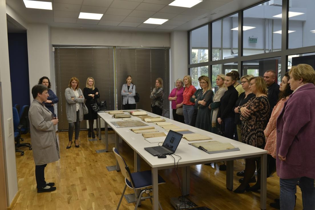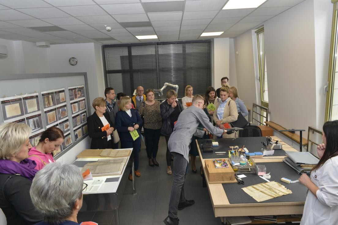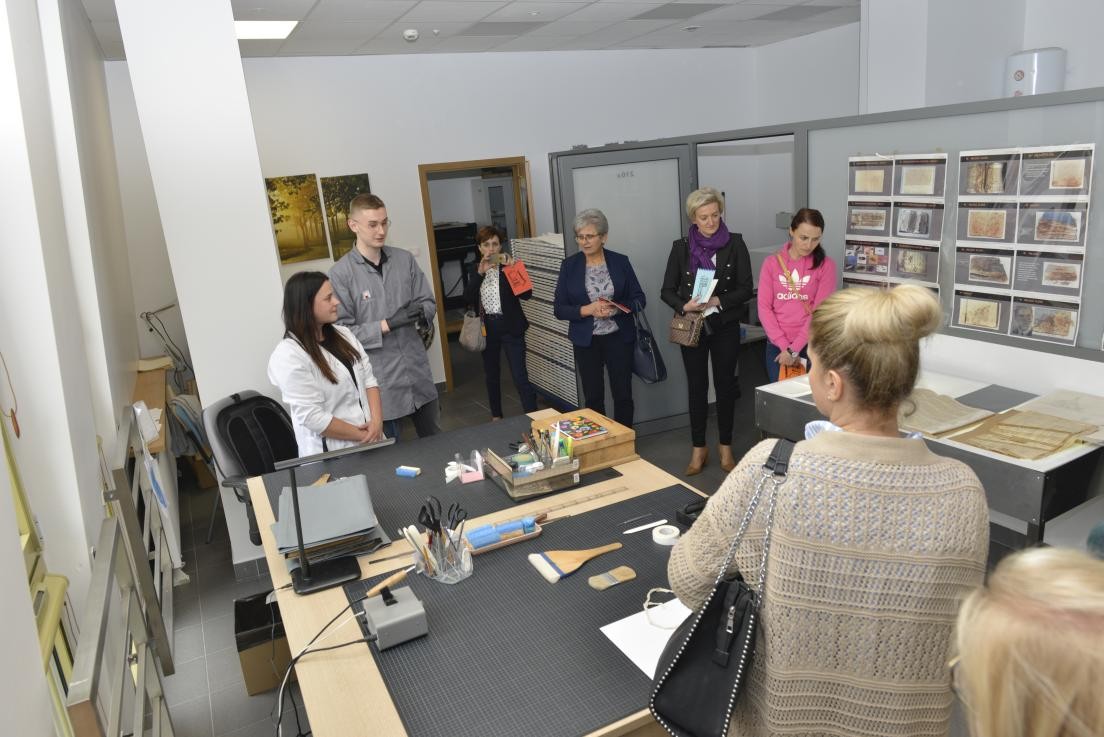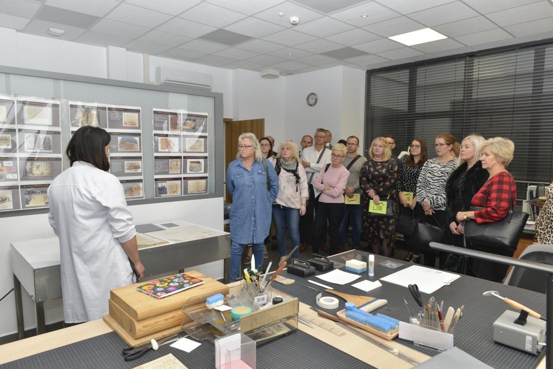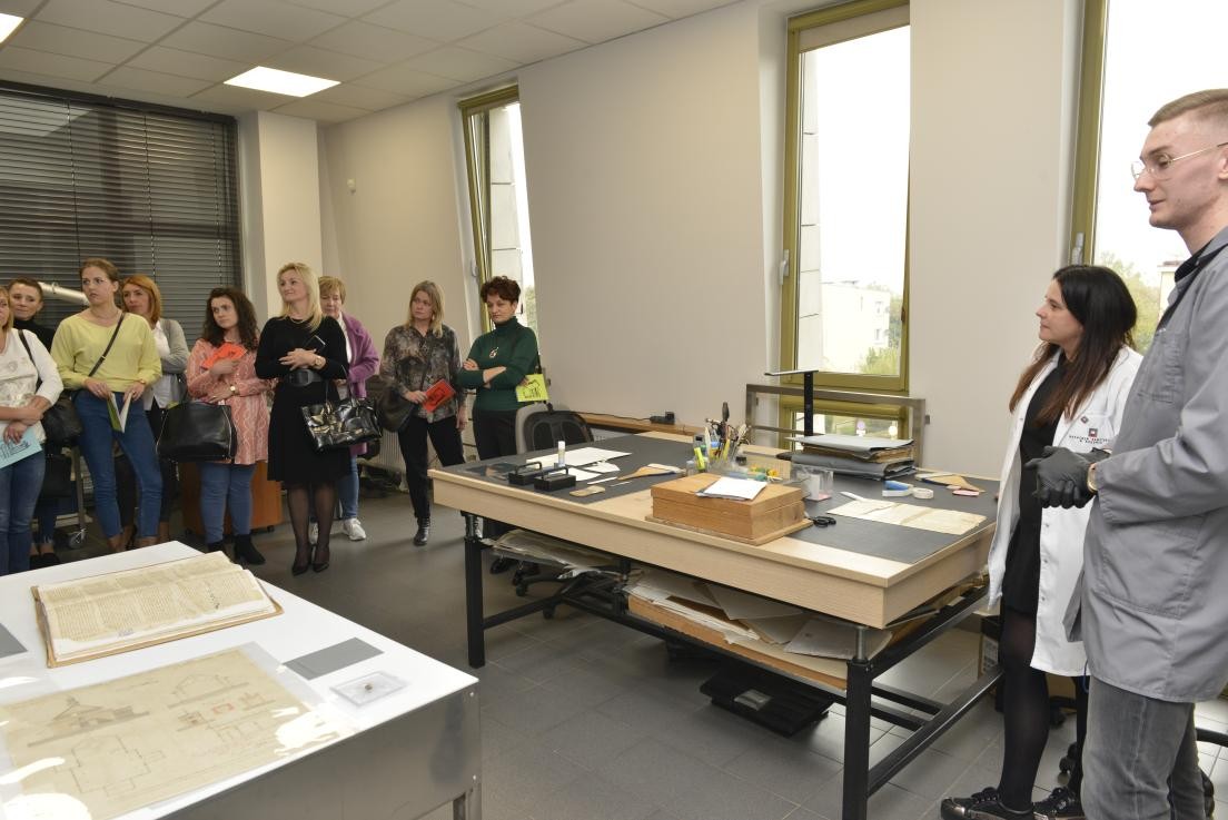 Uczestnicy poznali wszystkie etapy wędrówki materiałów: od pomieszczenia akcesji poprzez ewidencję, konserwację i digitalizację, aż do udostępniania w formie tradycyjnej oraz w serwisie www.szukajwarchiwach.gov.pl.