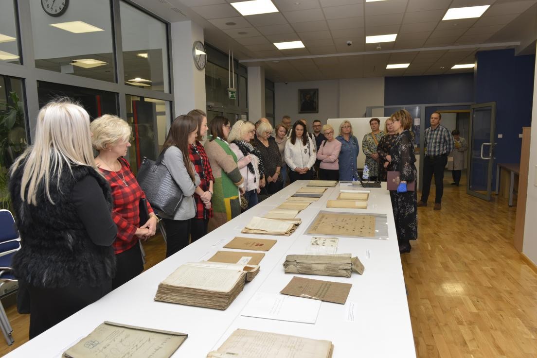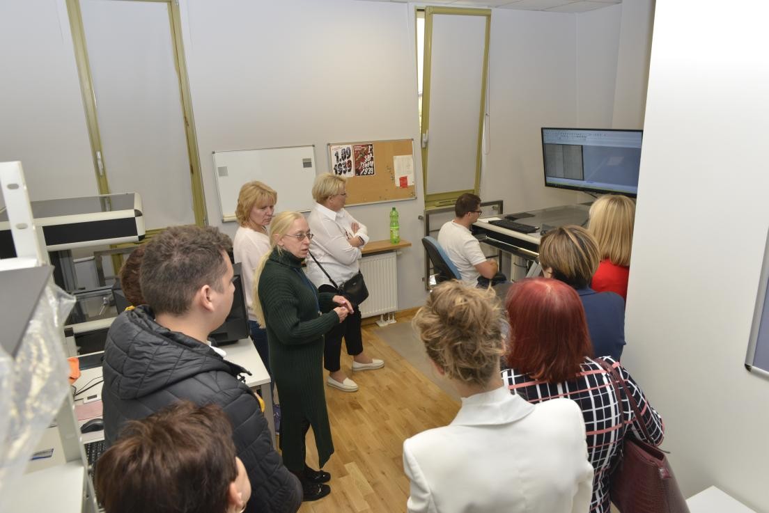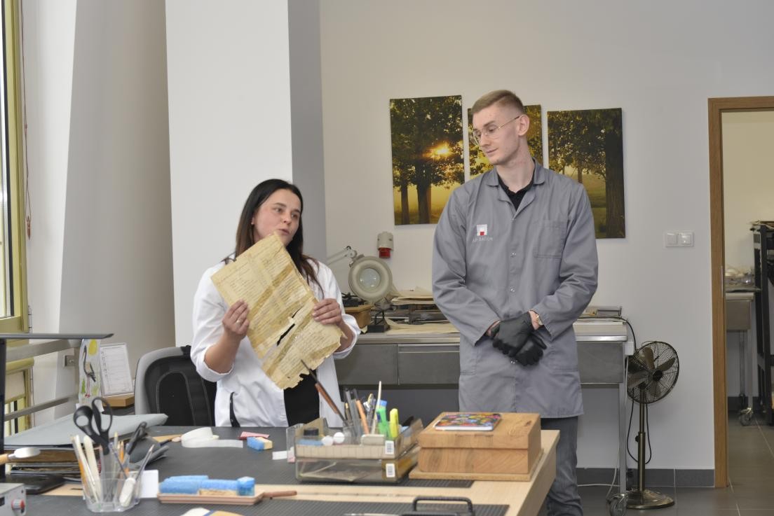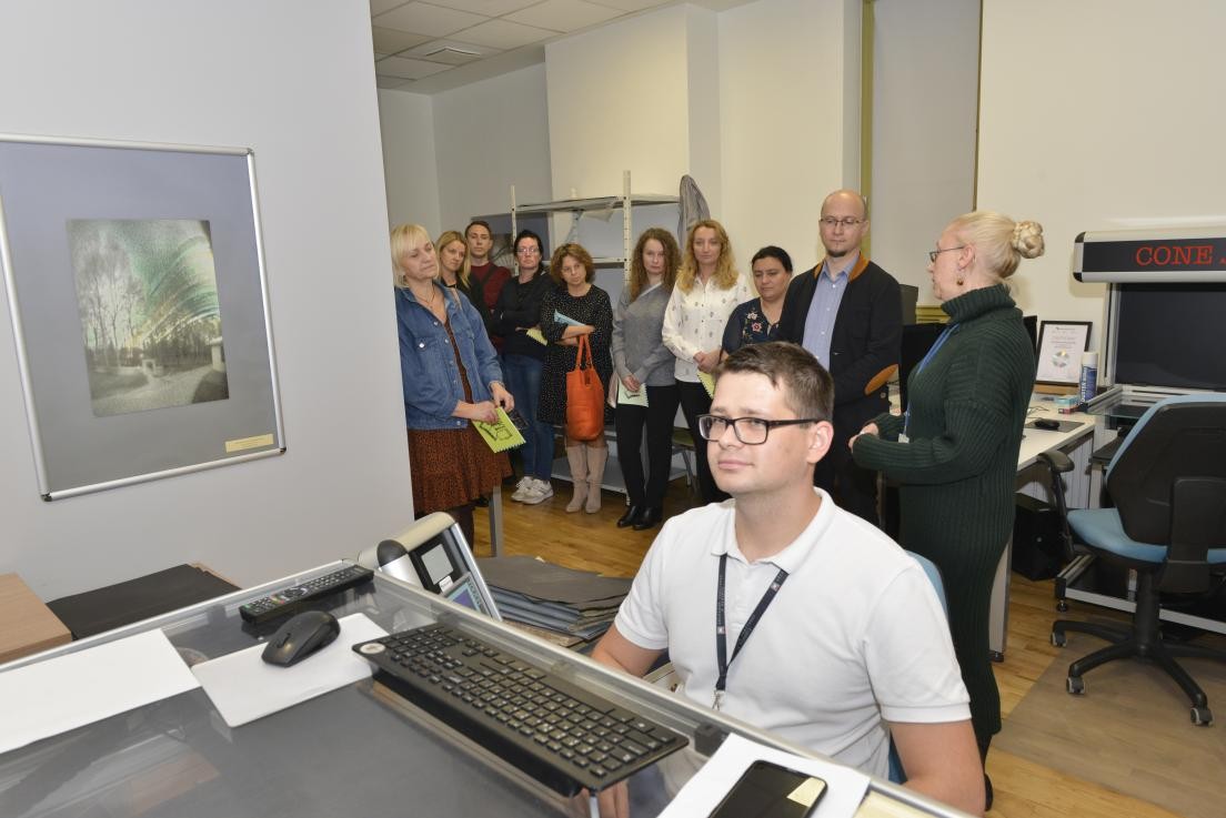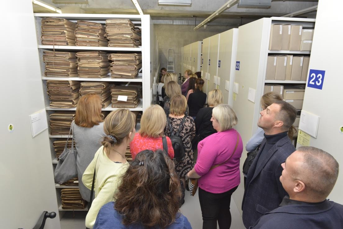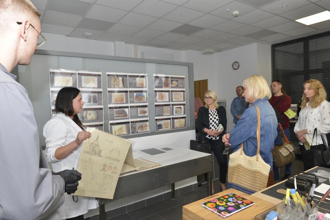 Uczestnicy poznali wszystkie etapy wędrówki materiałów: od pomieszczenia akcesji poprzez ewidencję, konserwację i digitalizację, aż do udostępniania w formie tradycyjnej oraz w serwisie www.szukajwarchiwach.gov.pl.