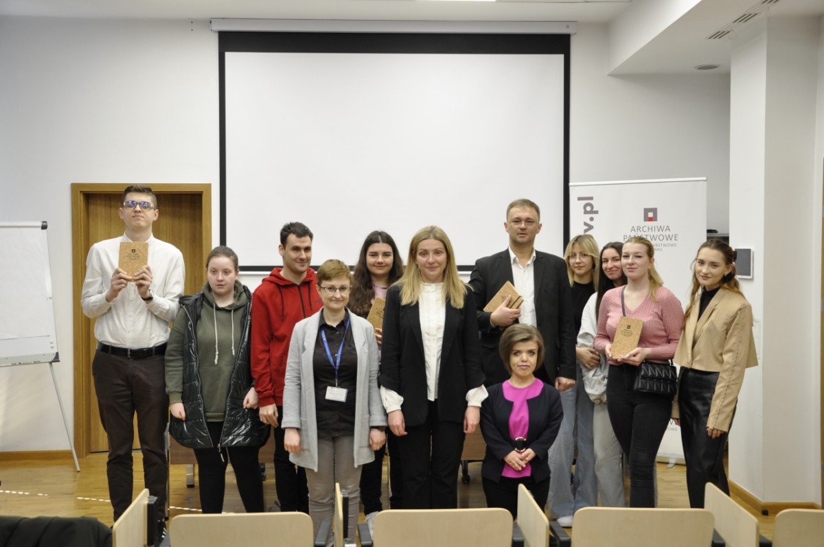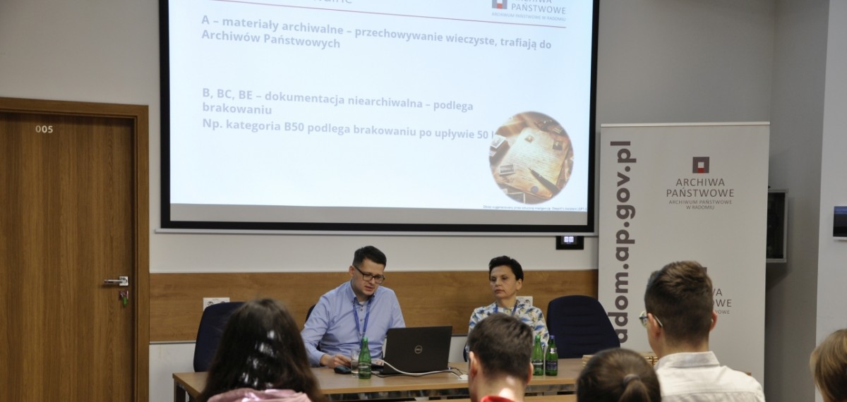 Przybyłych powitała Pani Dyrektor Ewelina Majsterek. Później Pan Patryk Stankowski, archiwista w Oddziale III udostępniania zasobu archiwalnego, wygłosił prelekcję pt. „Sieć archiwów państwowych. Archiwum Państwowe w Radomiu – historia, zasób, udostępnianie„. Następnie głos zabrała Pani Joanna Dwojak, zajmująca stanowisko do spraw kadr i rozwoju zawodowego, która zaznajomiła słuchaczy z procedurami rekrutacji i naboru na wolne stanowiska w jednostkach administracji publicznej oraz opowiedziała o zasadach odbywania praktyk w naszym urzędzie.