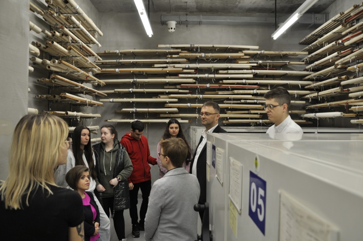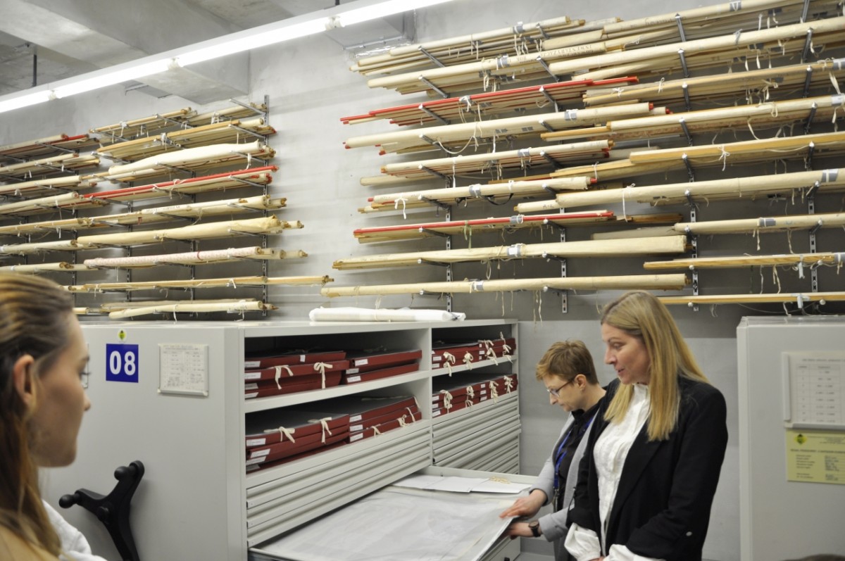 Wizytę zwieńczyło oprowadzenie gości po magazynach archiwalnych, którego dokonały Pani Dyrektor oraz Pani Aleksandra Nosowska, Kierownik Oddziału II ewidencji, opracowania i zabezpieczania zasobu archiwalnego.