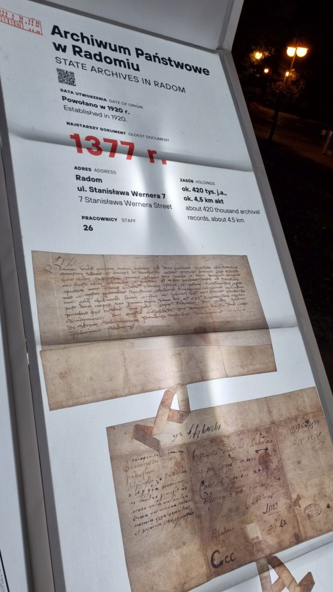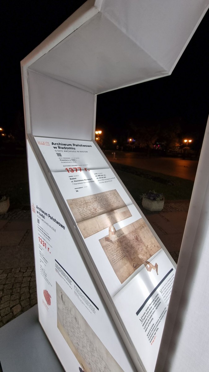 Wspomniana instalacja w ramach swojej podróży po kraju zawitała do naszego miasta, przez co radomianie zyskali wyjątkową okazję, aby zobaczyć reprodukcje najstarszych dokumentów ze wszystkich polskich archiwów państwowych, będących przedmiotem tej zajmującej wystawy.